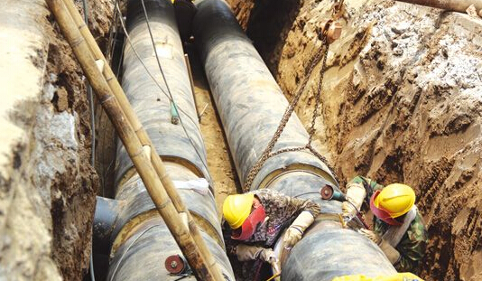 圖為施工人員利用微型手拉葫蘆進(jìn)行天然氣管道鋪設(shè)作業(yè)集中供熱工...